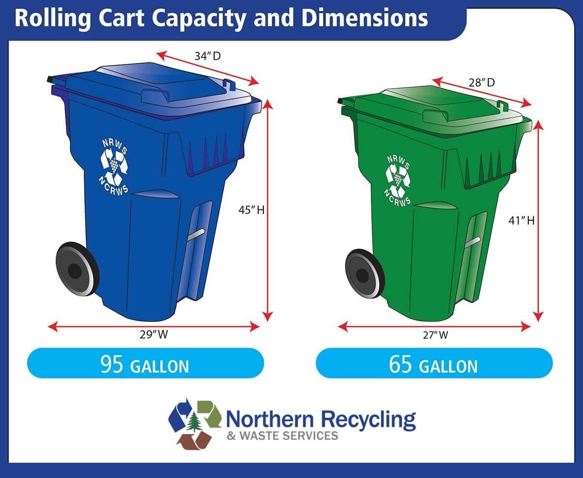 Select a size of gray cart for weekly collection — 35, 65 or 95 gallon. The 95 gallon cart is twice as expensive as the 35 gallon cart. You’ll save money by reducing your waste by correctly recycling and composting.