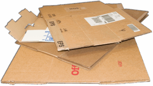 Clean, dry cardboard goes in the recycling cart. Please break down/flatten boxes so they fit in the cart.