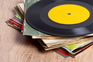 Vinyl records go in the landfill cart. If the outside cover is made of paperboard, it goes in the recycle cart.